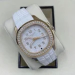 The Aquanaut Luce collection welcomes a new ladies’ travel watch with the new E 23-250 S FUS 24H Travel Time (dual time zone) quartz movement. The discreet and practical crown adjustment system ensures the Aquanaut Luce remains as elegant as ever. The 38.8 mm rose gold case, featuring contrasting polished and satin finishes, is water-resistant to 60 m. It is paired with a matte white dial and an integrated composite strap. The bezel is lit up by 48 diamonds (~1.11 ct), while the patented fold-over clasp is secured by four independent catches.