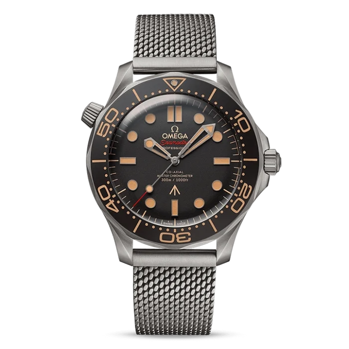 Identical to 007’s watch in No Time To Die this 42mm Seamaster, in strong yet lightweight Grade 2 Titanium, sports a brown tropical aluminium bezel ring and dial.