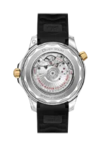 This 42 mm model is crafted from stainless steel and 18K yellow gold, and includes a black ceramic bezel with a Ceragold™ diving scale. The dial is also polished black ceramic and features laser-engraved waves and a date window at 6 o’clock.