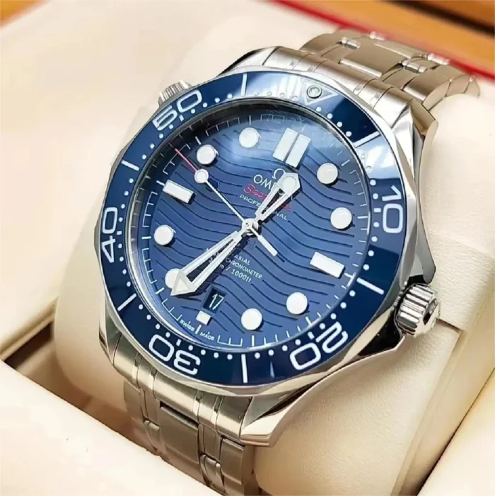 This 42 mm model is crafted from stainless steel and includes a blue ceramic bezel with a white enamel diving scale. The dial is also polished blue ceramic and features laser-engraved waves and a date window at 6 o’clock.