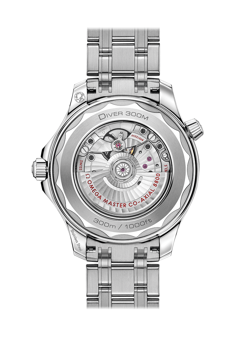 The watch is equipped with a polished and brushed stainless steel bracelet and is powered by the Omega Master Chronometer movement 8800, which is clearly visible through the sapphire crystal glass on the wave-edged case back.