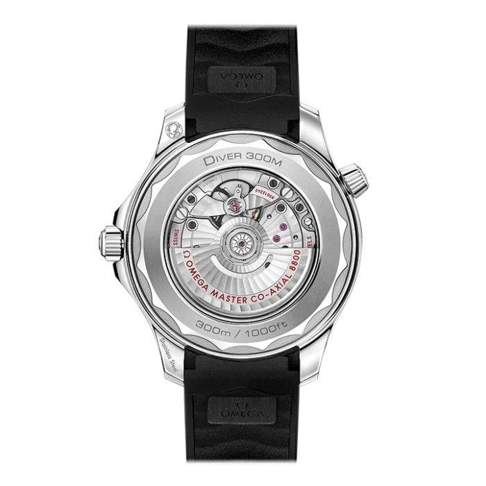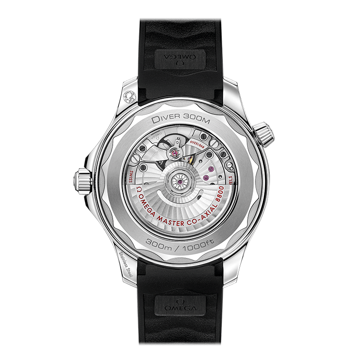 The watch is presented on a black rubber strap and is driven by the OMEGA Master Chronometer Calibre 8800, which can be seen through the sapphire-crystal on the wave-edged caseback.