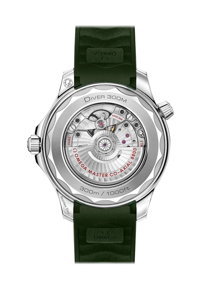 The watch is presented on a green rubber strap and is driven by the OMEGA Master Chronometer Calibre 8800, which can be seen through the sapphire-crystal on the wave-edged caseback.