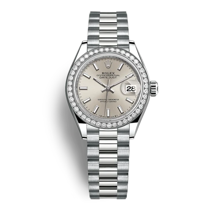 The light reflections on the case sides and lugs highlight the elegant profile of the 28 mm Oyster case, which is fitted with a diamond-set bezel. Rolex’s classic feminine watch, the Lady-Datejust is in the lineage of the Datejust, the emblematic model that has been a byword for style and accurate timekeeping.