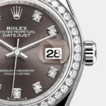 The light reflections on the case sides and lugs highlight the elegant profile of the 28 mm Oyster case, which is fitted with a diamond-set bezel. Rolex’s classic feminine watch, the Lady-Datejust is in the lineage of the Datejust, the emblematic model that has been a byword for style and accurate timekeeping.