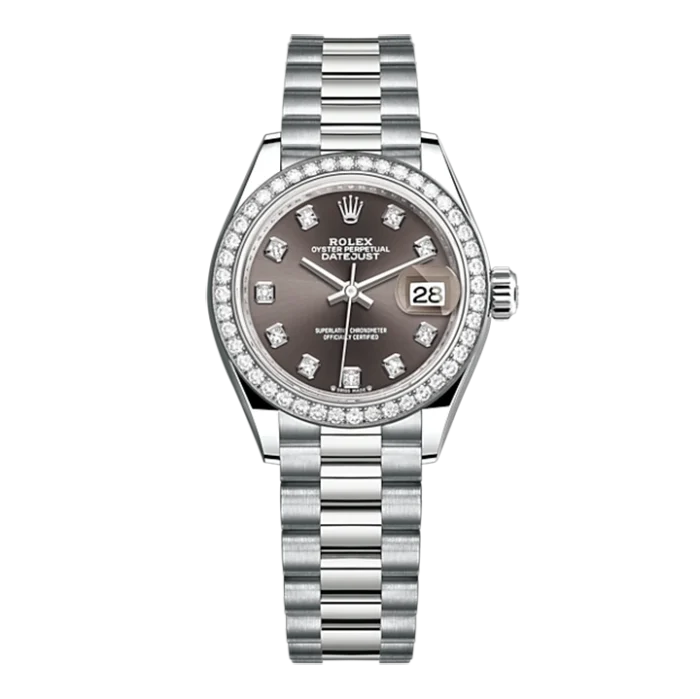 THIS OYSTER PERPETUAL LADY-DATEJUST IN 18 CT WHITE GOLD FEATURES A DARK GREY, DIAMOND-SET DIAL AND A PRESIDENT BRACELET.