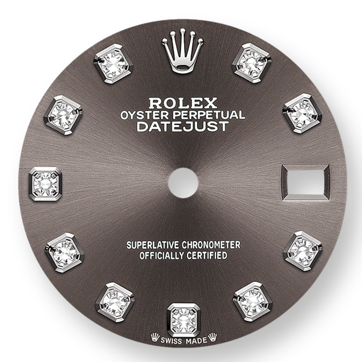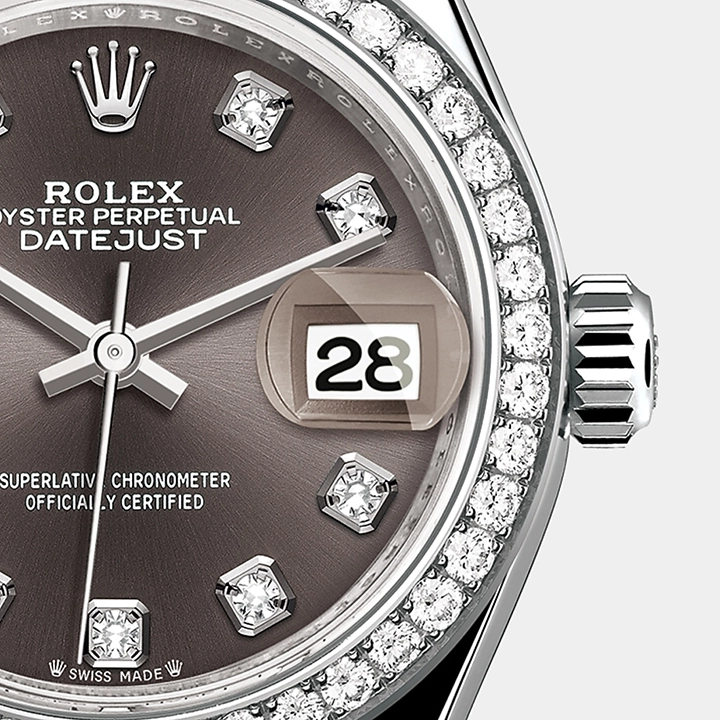 The light reflections on the case sides and lugs highlight the elegant profile of the 28 mm Oyster case, which is fitted with a diamond-set bezel. Rolex’s classic feminine watch, the Lady-Datejust is in the lineage of the Datejust, the emblematic model that has been a byword for style and accurate timekeeping.