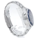 This OMEGA Seamaster Diver 300M features a blue dial decorated with a wave pattern. There is a date window at the 3 o’clock position, 30-minute and 12-hour recorders and a small seconds dial. The distinctive dial is visible through a scratch-resistant sapphire crystal. The blue unidirectional rotating bezel is mounted on a 41.5 mm stainless steel case with a helium-escape valve at 10 o’clock.