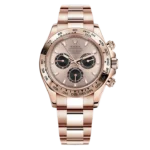 THIS OYSTER PERPETUAL COSMOGRAPH DAYTONA IN 18 KT EVEROSE GOLD, WITH A SUNDUST AND BLACK DIAL AND AN OYSTER BRACELET, FEATURES 18 KT EVEROSE GOLD BEZEL WITH ENGRAVED TACHYMETRIC SCALE.