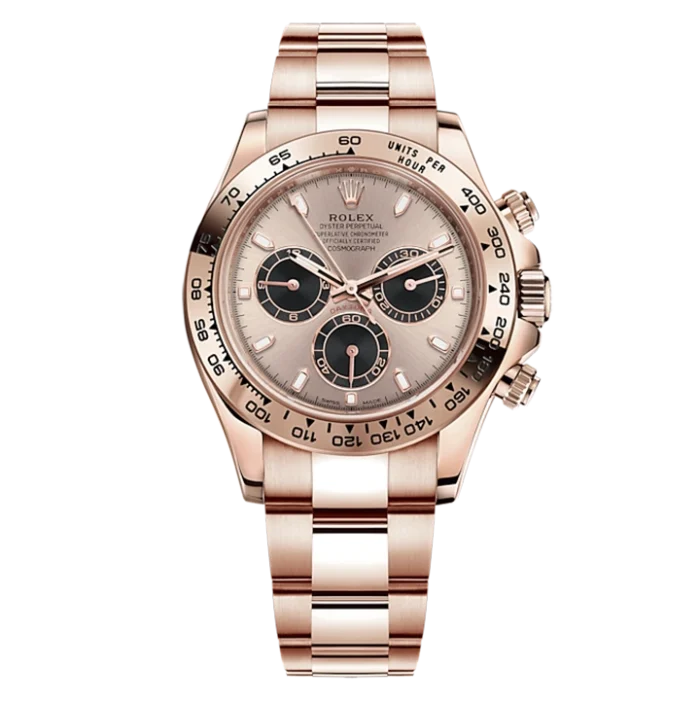 THIS OYSTER PERPETUAL COSMOGRAPH DAYTONA IN 18 KT EVEROSE GOLD, WITH A SUNDUST AND BLACK DIAL AND AN OYSTER BRACELET, FEATURES 18 KT EVEROSE GOLD BEZEL WITH ENGRAVED TACHYMETRIC SCALE.