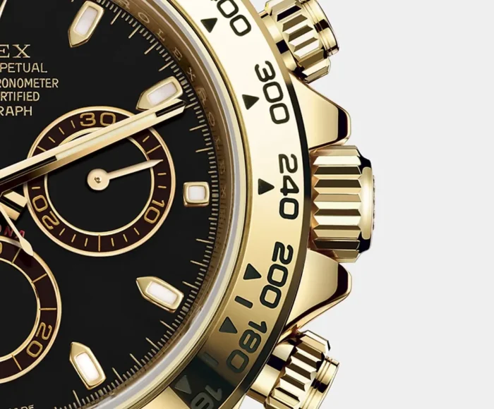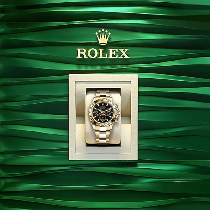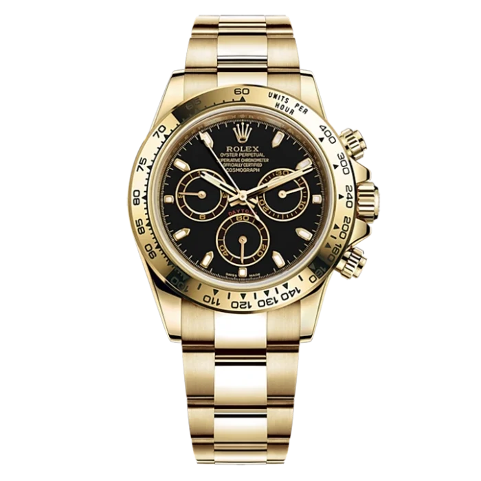 THIS OYSTER PERPETUAL COSMOGRAPH DAYTONA IN 18 KT YELLOW GOLD, WITH A BLACK DIAL AND AN OYSTER BRACELET, FEATURES 18 KT YELLOW GOLD BEZEL WITH ENGRAVED TACHYMETRIC SCALE.