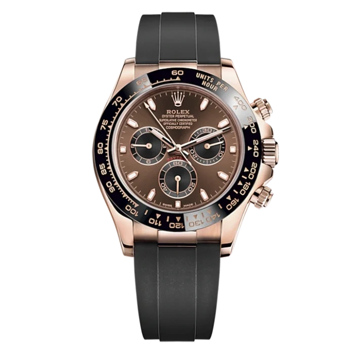THIS OYSTER PERPETUAL COSMOGRAPH DAYTONA IN 18 CT EVEROSE GOLD WITH A CHOCOLATE AND BLACK DIAL AND AN OYSTERFLEX BRACELET, FEATURES A BLACK CERACHROM BEZEL WITH TACHYMETRIC SCALE.