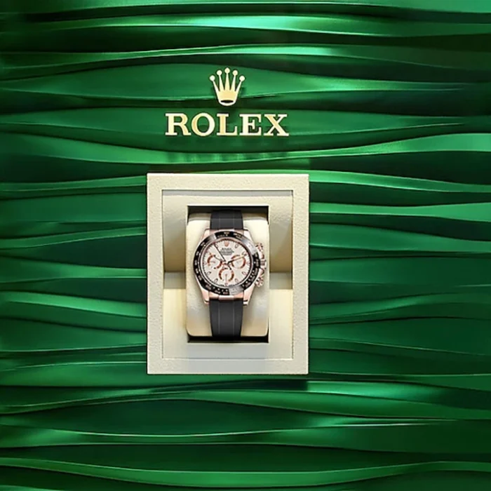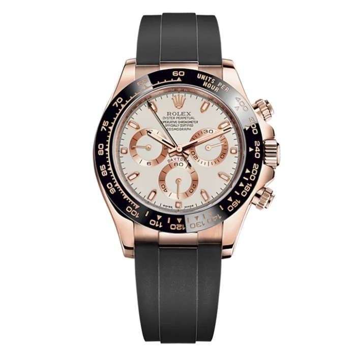 THIS OYSTER PERPETUAL COSMOGRAPH DAYTONA IN 18 KT EVEROSE GOLD WITH AN IVORY DIAL AND AN OYSTERFLEX BRACELET, FEATURES A BLACK CERACHROM BEZEL WITH TACHYMETRIC SCALE.