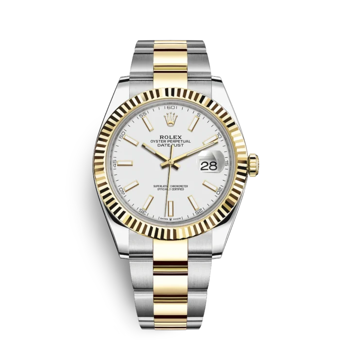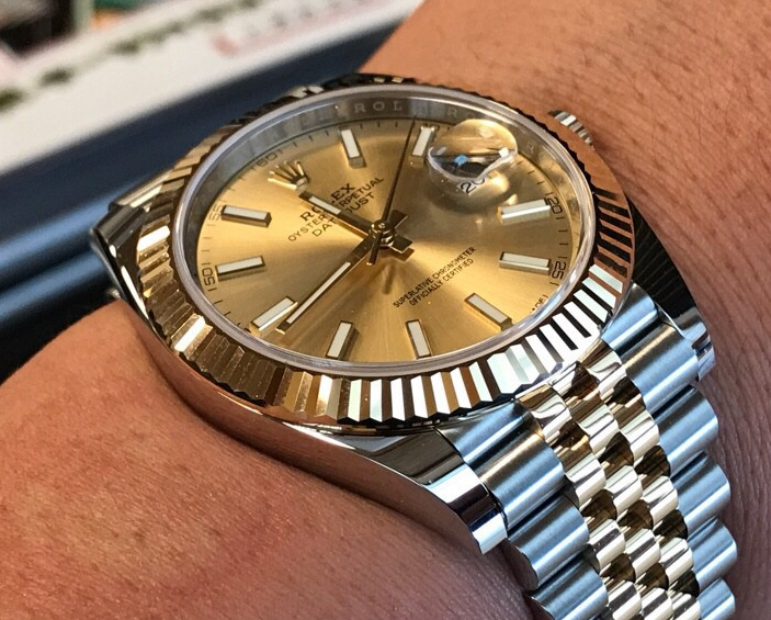 THIS OYSTER PERPETUAL DATEJUST 41 IN OYSTERSTEEL AND YELLOW GOLD FEATURES A CHAMPAGNE-COLOUR DIAL AND A JUBILEE BRACELET.