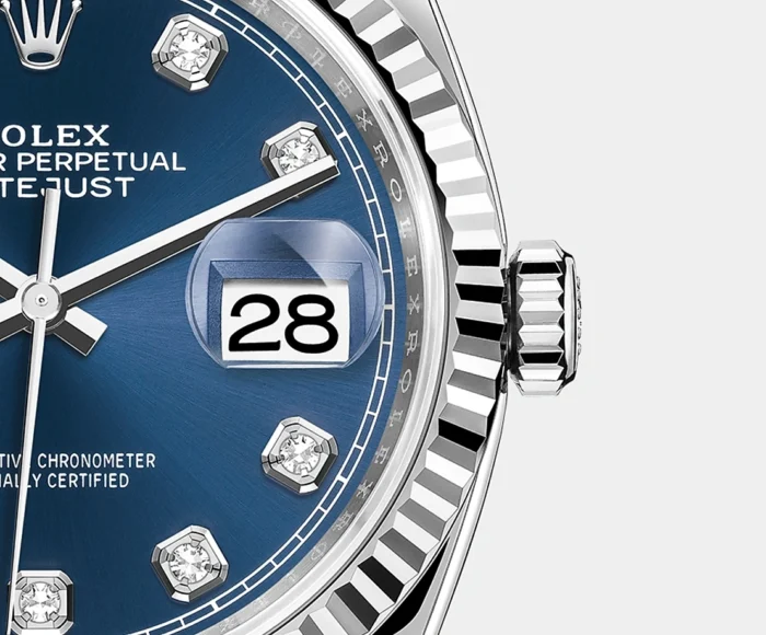 The Rolex fluted bezel is a mark of distinction. Originally, the fluting of the Oyster bezel had a functional purpose: it served to screw the bezel onto the case helping to ensure the waterproofness of the watch. It was therefore identical to the fluting on the case back, which was also screwed onto the case for waterproofness, using specific Rolex tools. Over time, the fluting became an aesthetic element, a genuine Rolex signature feature. Today the fluted bezel is a mark of distinction, in gold on this Datejust 36.