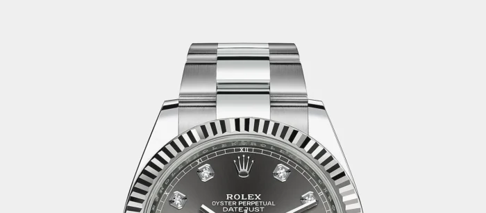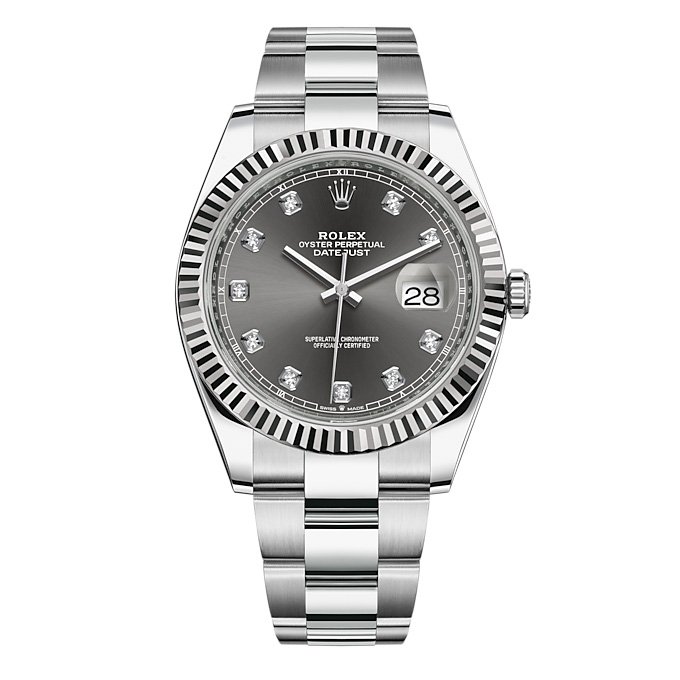 THIS OYSTER PERPETUAL DATEJUST 41 IN OYSTERSTEEL AND WHITE GOLD FEATURES A SLATE, DIAMOND-SET DIAL AND AN OYSTER BRACELET.、