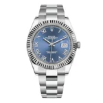 THIS OYSTER PERPETUAL DATEJUST 41 IN OYSTERSTEEL AND WHITE GOLD FEATURES AN AZZURRO-BLUE DIAL AND AN OYSTER BRACELET.