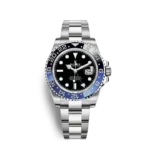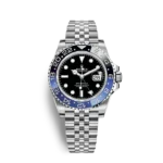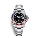 This model features a black dial and a two-colour Cerachrom bezel insert in red and blue ceramic. Designed to show the time in two different time zones simultaneously during intercontinental flights, the GMT-Master II has come to be recognized for its robustness and versatile appearance.
