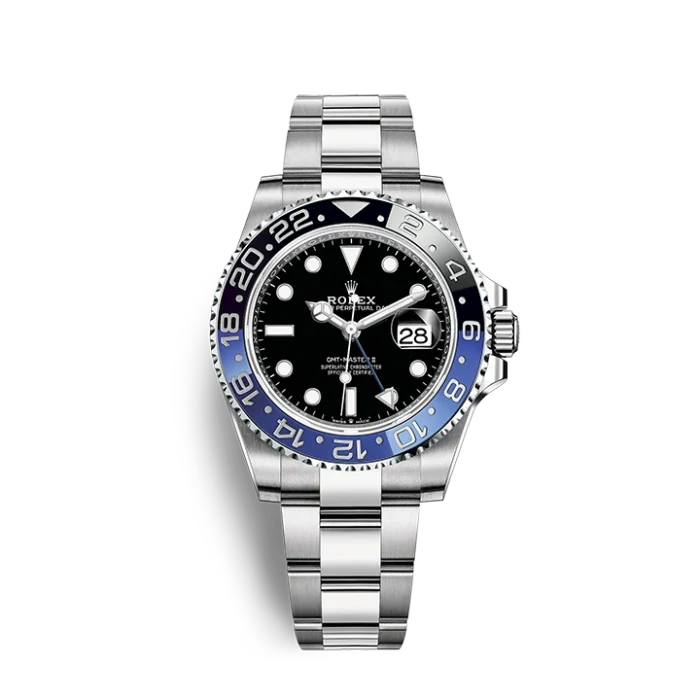 This model features a black dial and a two-colour Cerachrom bezel insert in red and blue ceramic. Designed to show the time in two different time zones simultaneously during intercontinental flights, the GMT-Master II has come to be recognized for its robustness and versatile appearance.