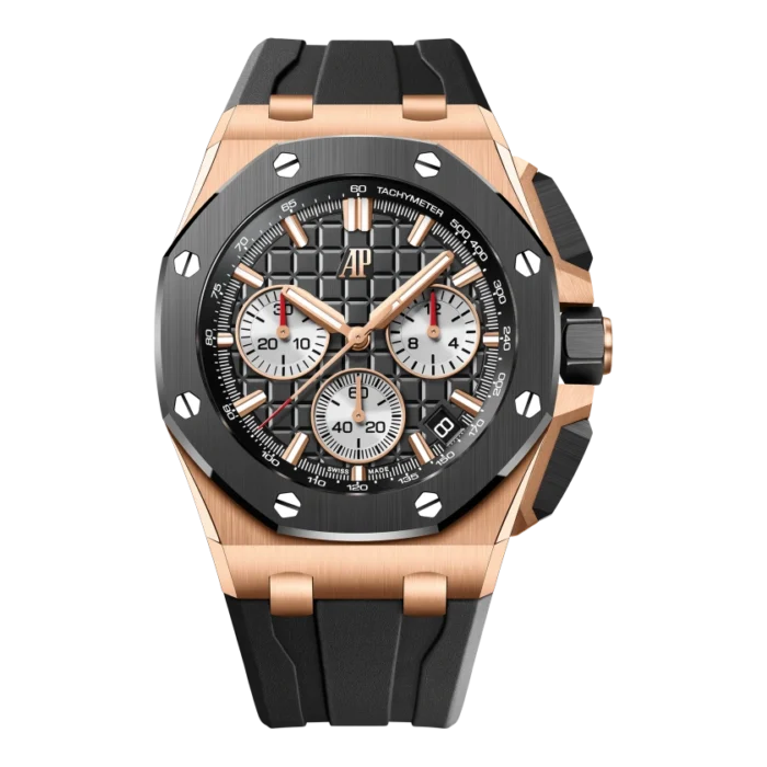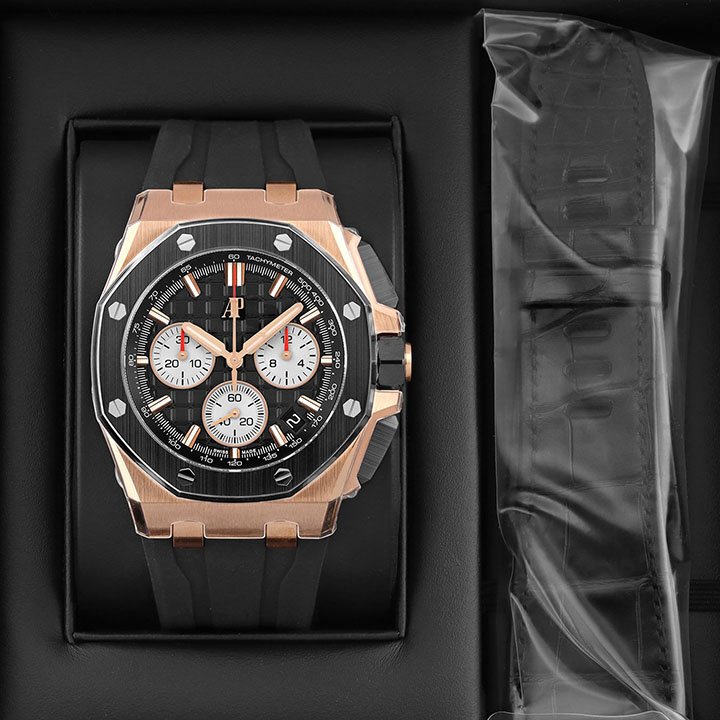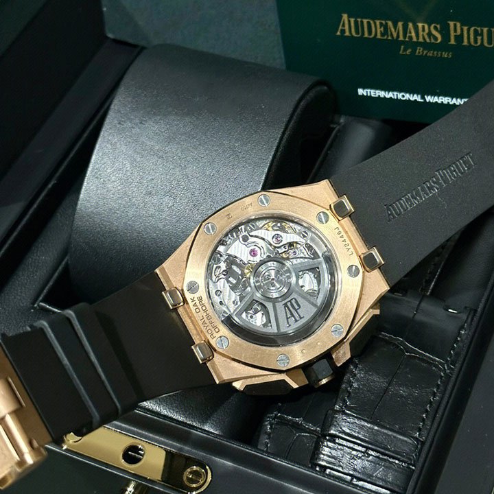 Interchangeable black rubber strap with 18K rose gold AP pin buckle.