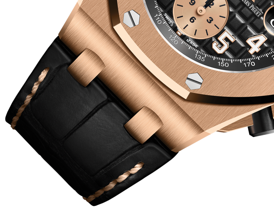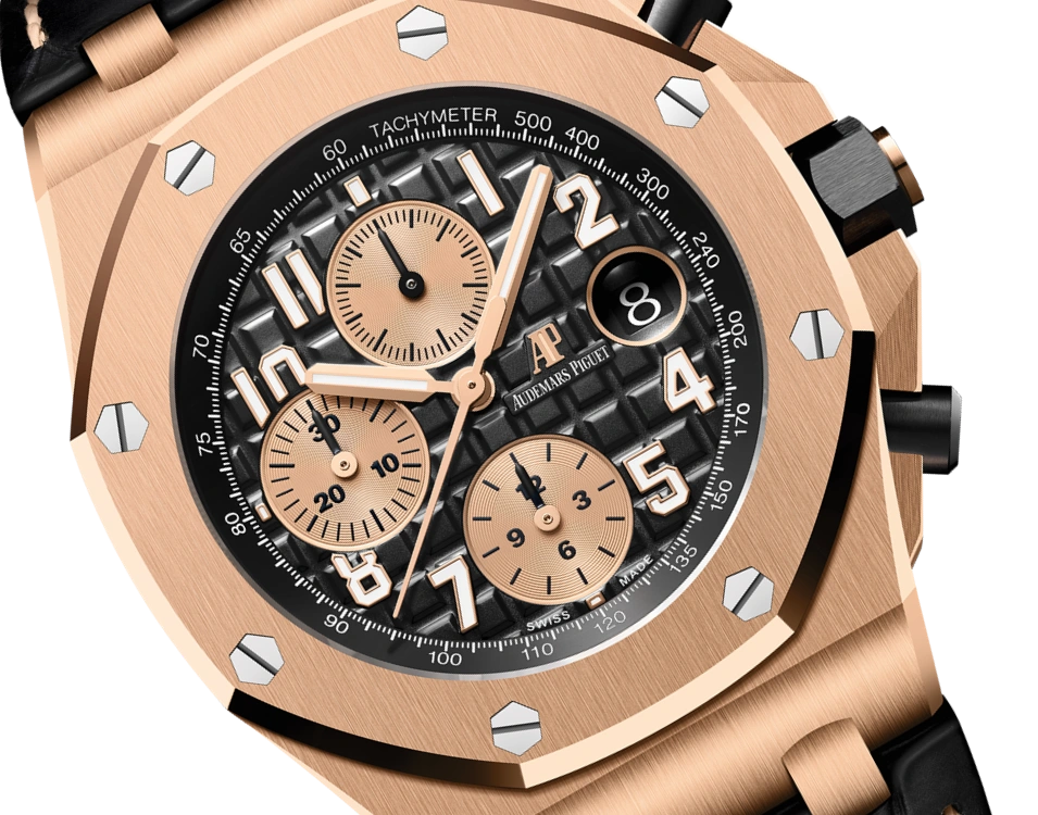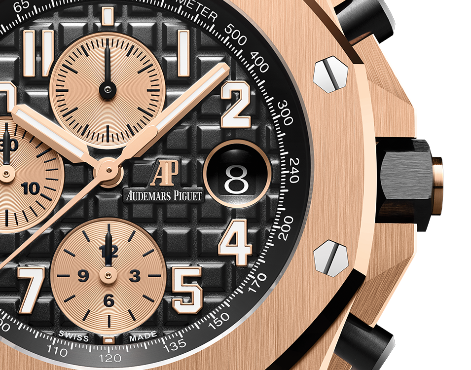 Black dial engraved with “Méga Tapisserie” oversized check decoration, with rose gold sub-dials, rose gold applied hour-markers and Royal Oak hands with luminescent coating, black inner bezel.