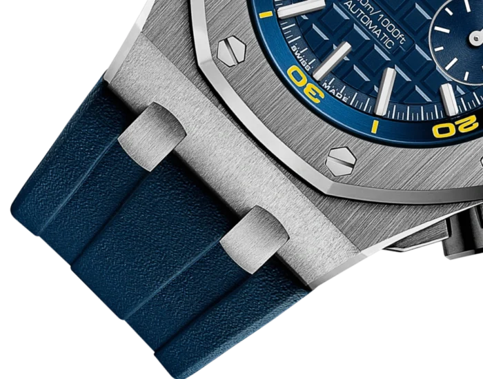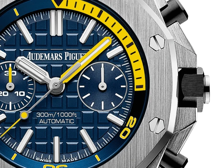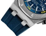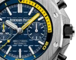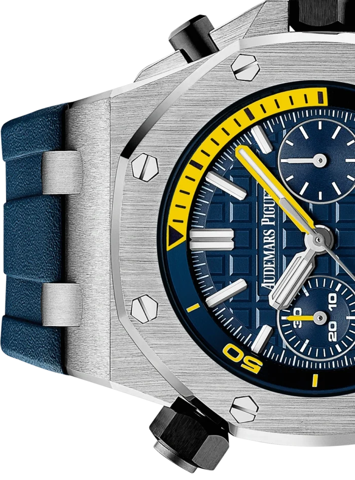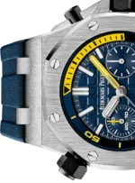 A blue Royal Oak Offshore with a splash of yellow, boasting fresh design and fun features. Dive into fun with the new Royal Oak Offshore Diver Chronographs, characterized by daring new design elements. Blackened white gold hands and hour-markers stand out against bright, high-contrast and funky colors.