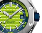 Green dial with “Méga Tapisserie” pattern, white gold applied hour-markers and Royal Oak hands with luminescent coating, blue rotating inner bezel with diving scale and zone from 60 to 15 minutes in yellow green.