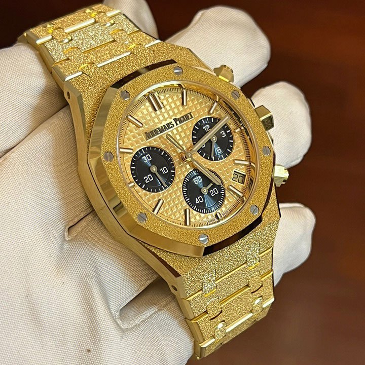 Yellow gold-toned dial with “Grande Tapisserie” pattern, black counters, yellow gold applied hour-markers and Royal Oak hands with luminescent coating.