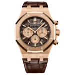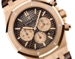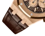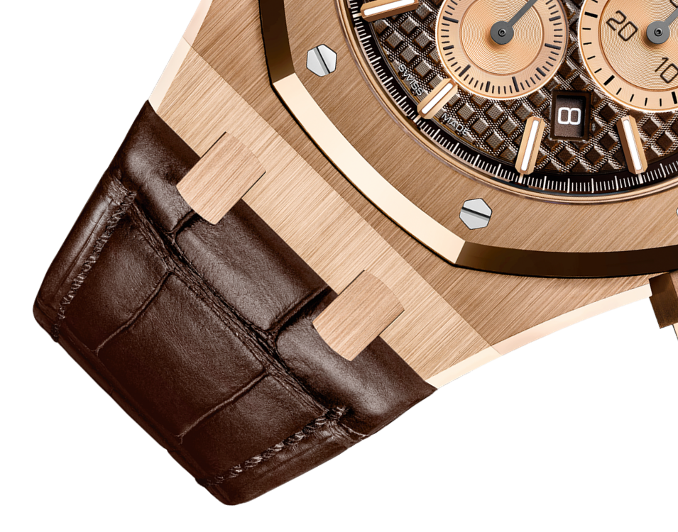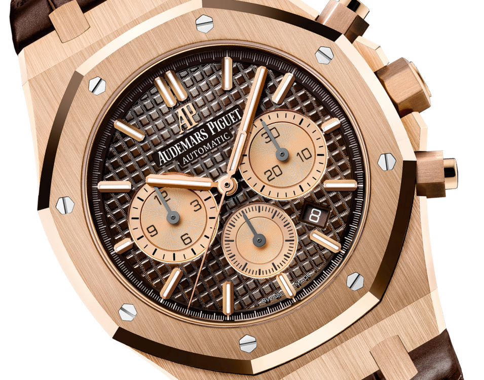 Brown dial with “Grande Tapisserie” pattern, pink gold-toned counters, pink gold applied hour-markers and Royal Oak hands with luminescent coating.