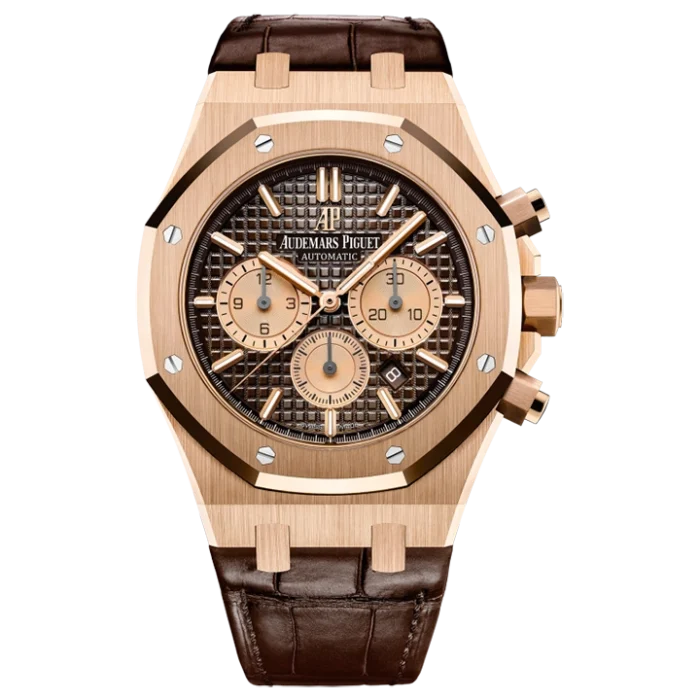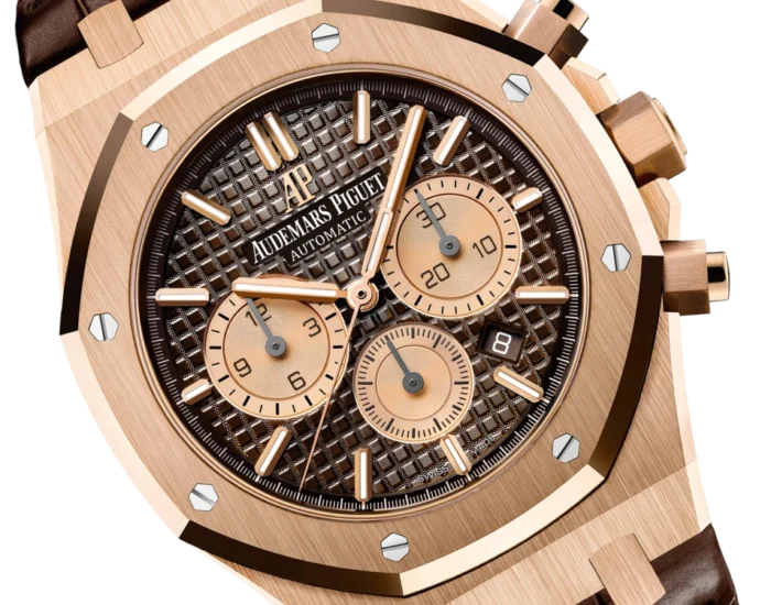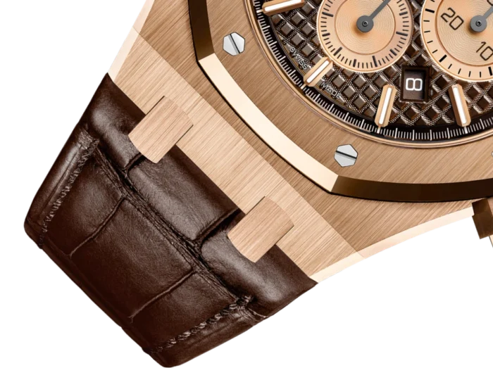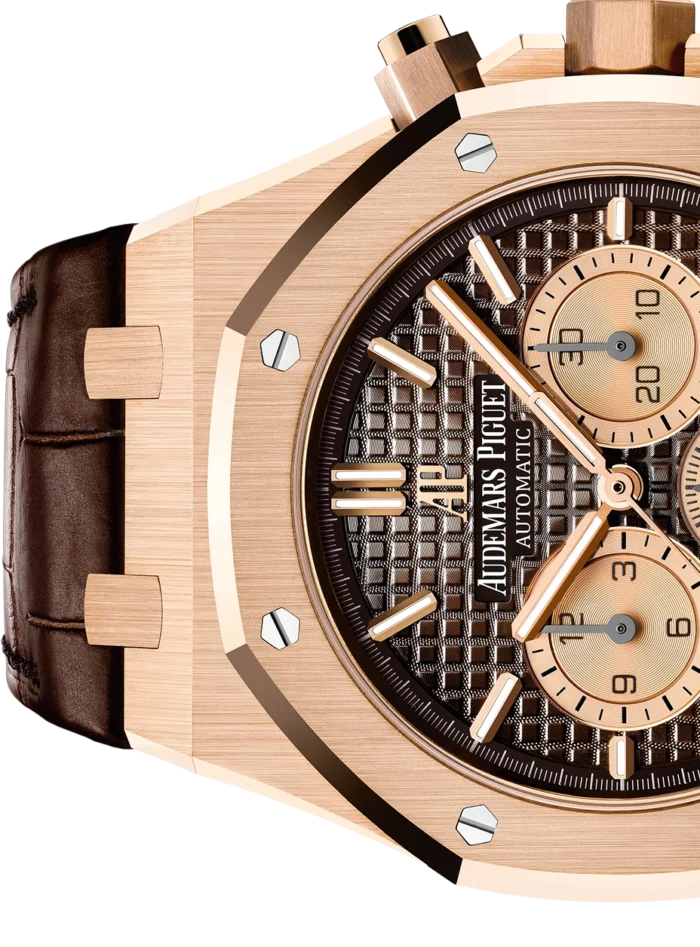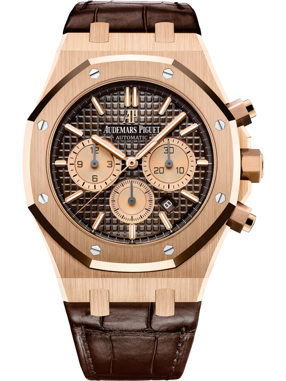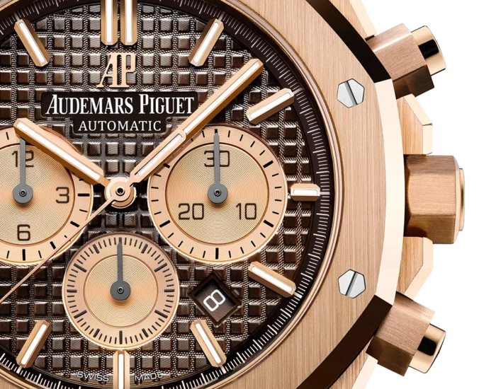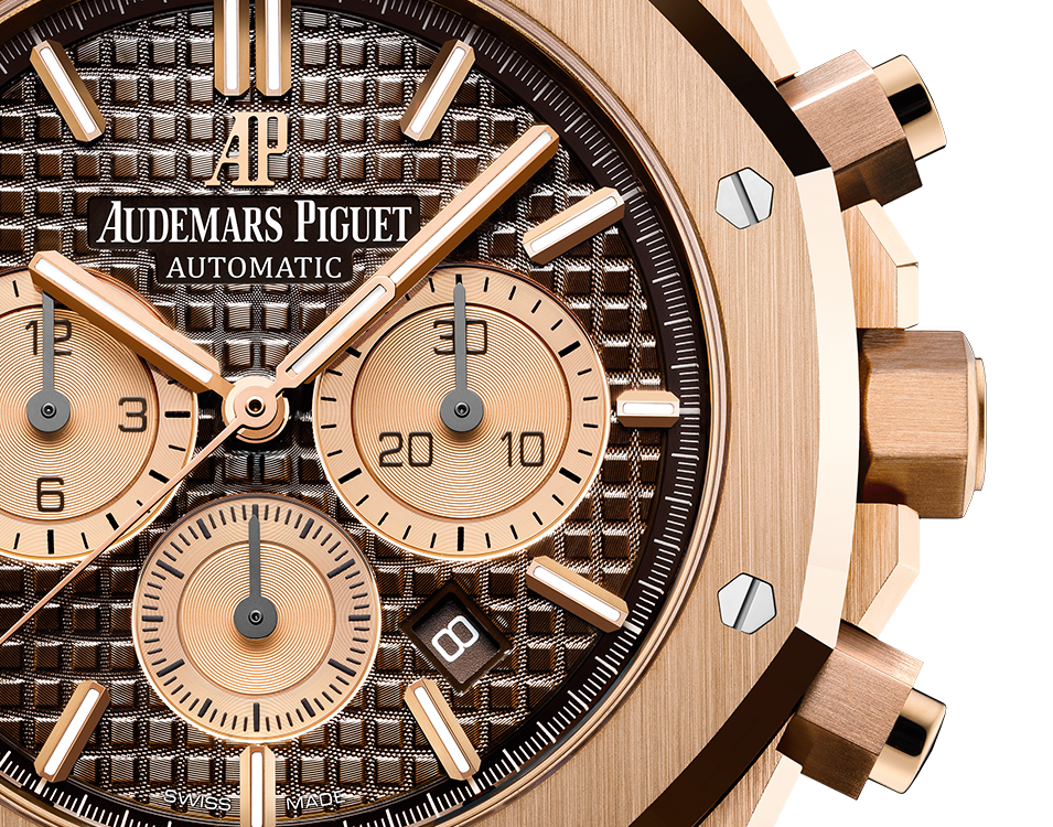 Brown dial with “Grande Tapisserie” pattern, pink gold-toned counters, pink gold applied hour-markers and Royal Oak hands with luminescent coating.