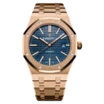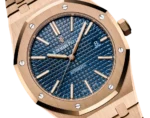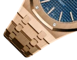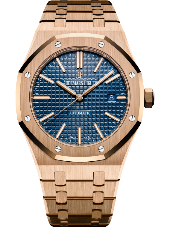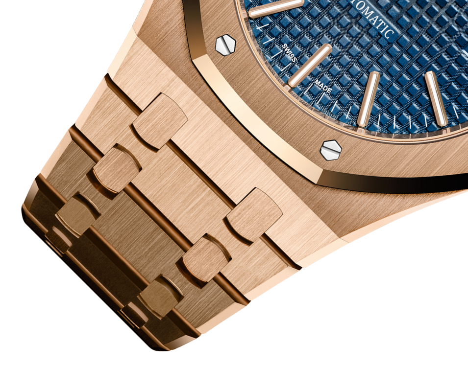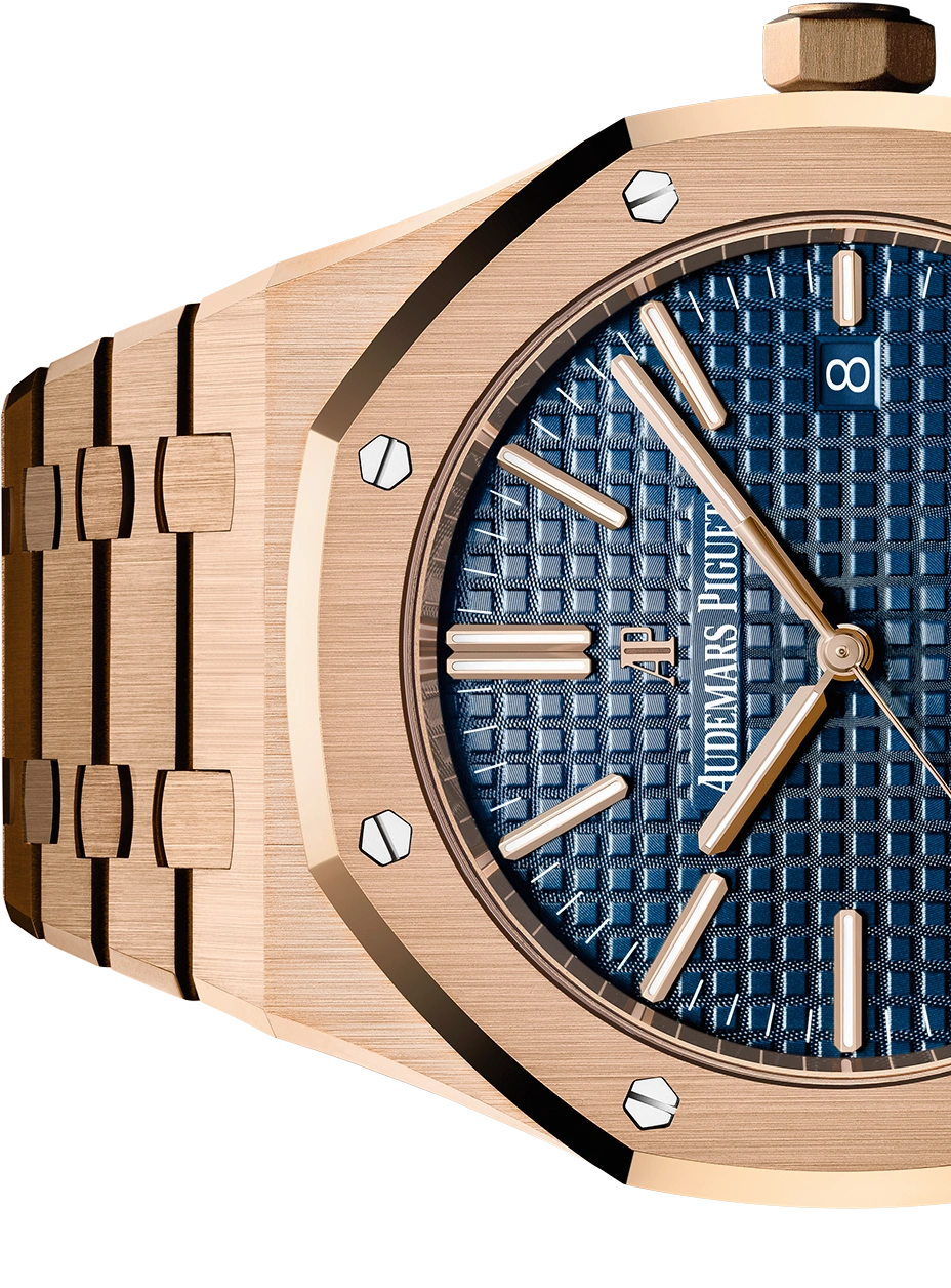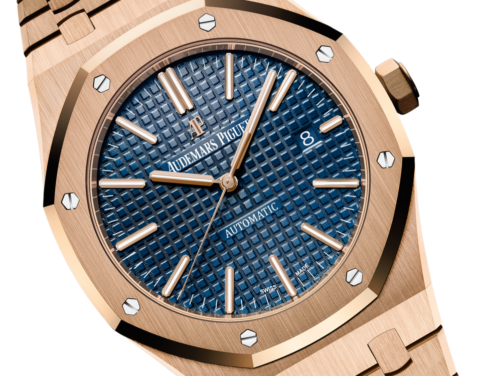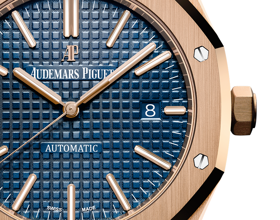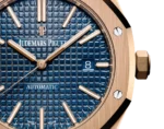 Blue dial with “Grande Tapisserie” pattern, pink gold applied hour-markers and Royal Oak hands with luminescent coating.