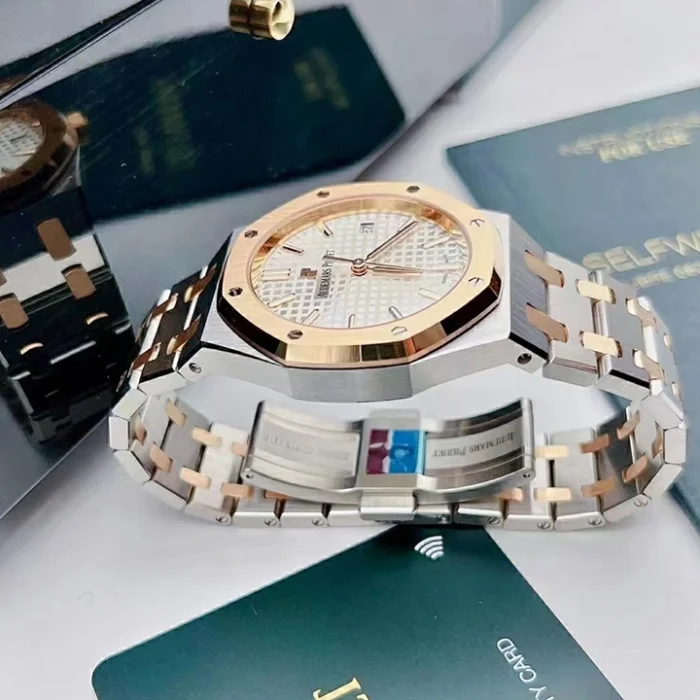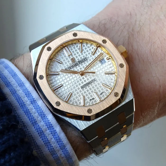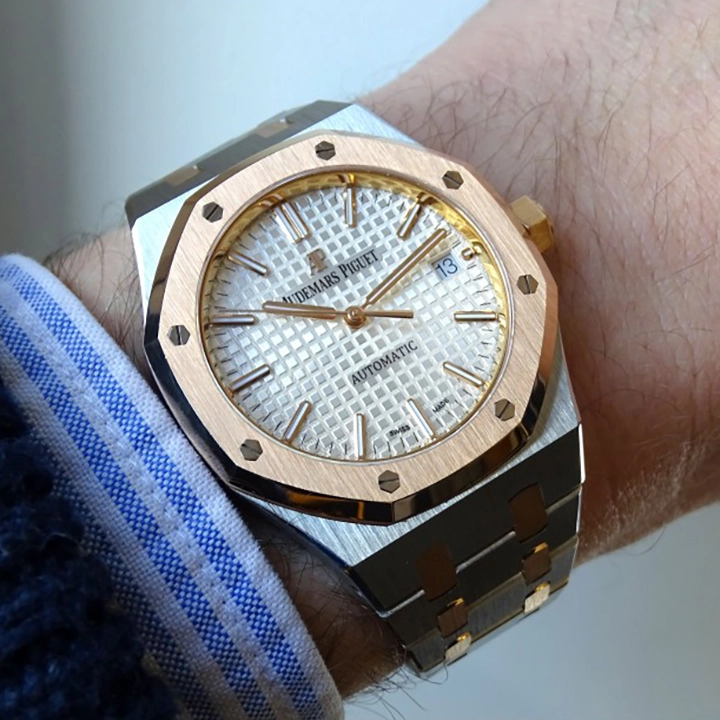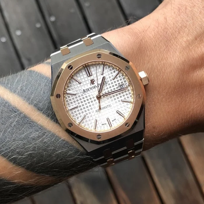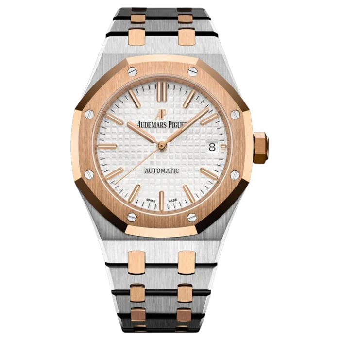 Silver-toned dial with “Grande Tapisserie” pattern, pink gold applied hour-markers and Royal Oak hands with luminescent coating.