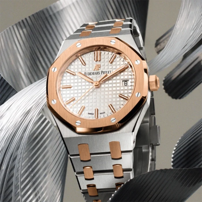The slender, architectural form of the Royal Oak is outlined in a 37 mm case size and a two-tone material mix: steel and 18-carat pink gold. A pink gold-toned “Grande Tapisserie” dial beautifully underlines the design of this horological icon.
