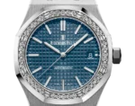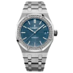 Blue dial with “Grande Tapisserie” pattern, white gold applied hour-markers and Royal Oak hands with luminescent coating.