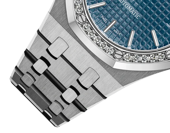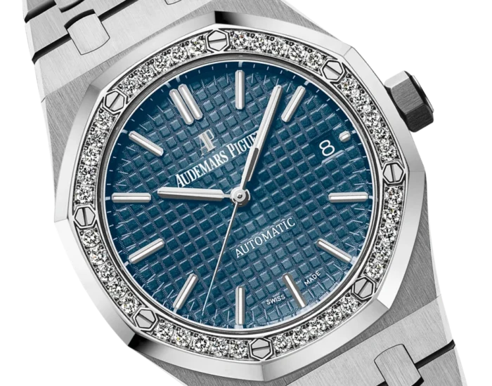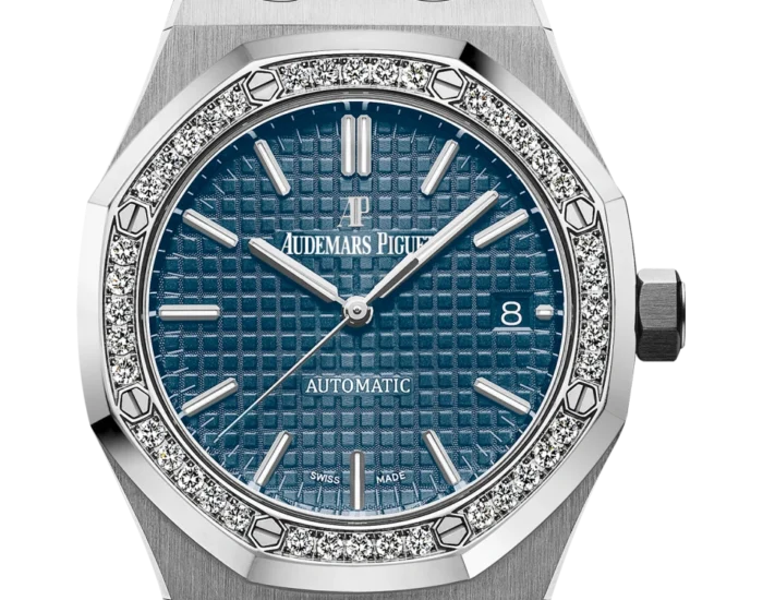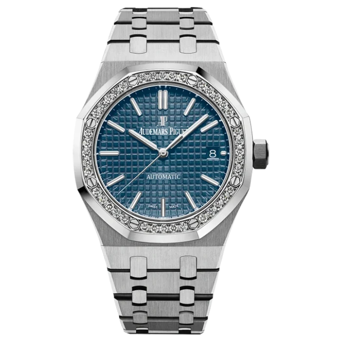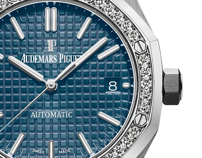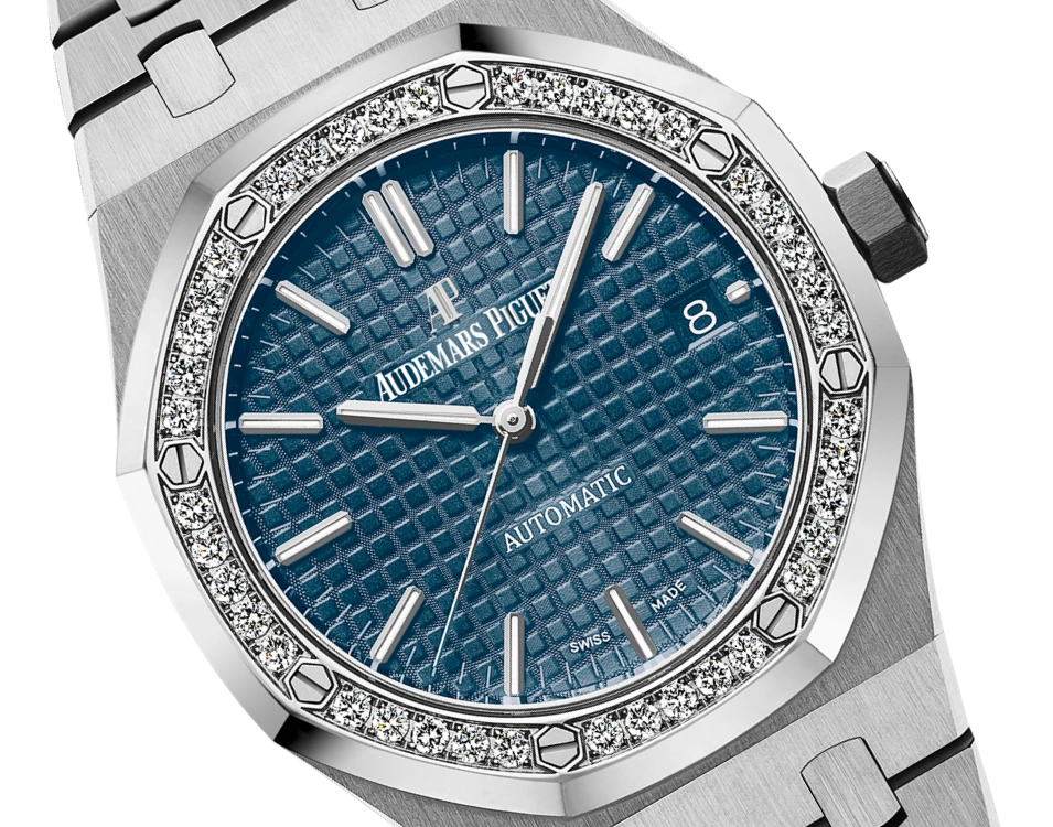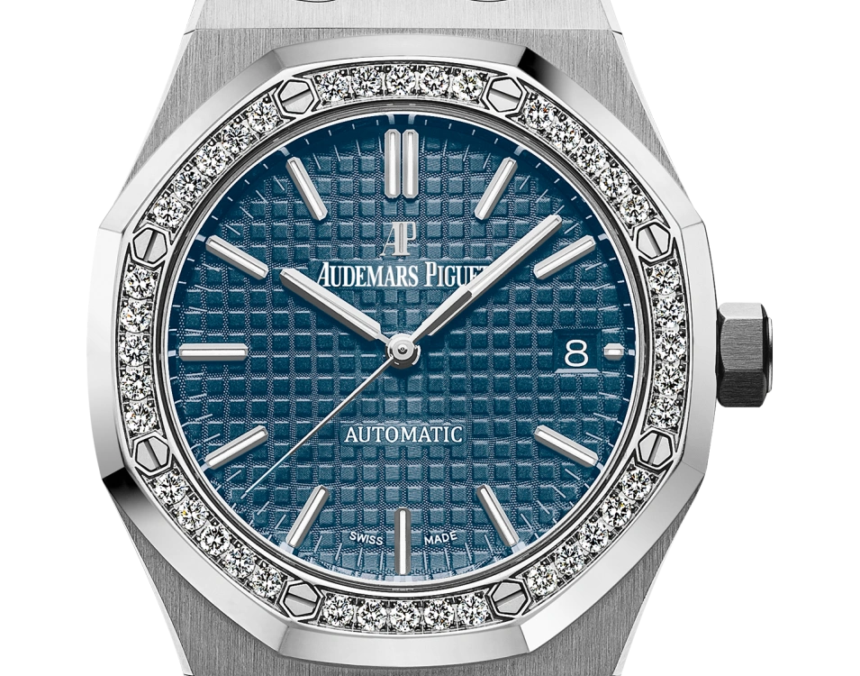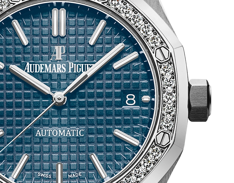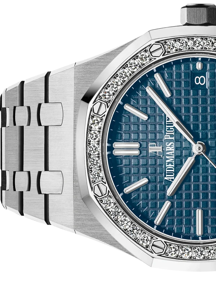Blue dial with “Grande Tapisserie” pattern, white gold applied hour-markers and Royal Oak hands with luminescent coating.