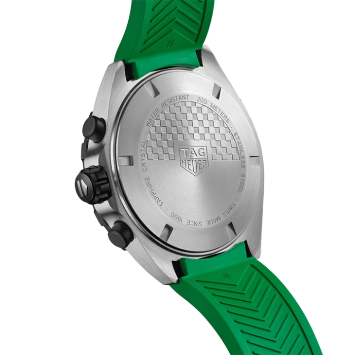With its sporty 43mm case, distinctive fixed bezel in black PVD and TAG Heuer logo in red, green and white, there’s no mistaking this cool chronograph.