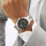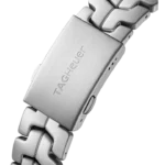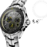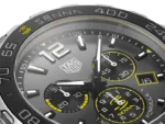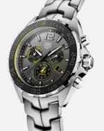 The tachymeter fixed bezel is in black ceramic, circular brushed to perfection. Under the hood, a TAG Heuer Swiss quartz movement.