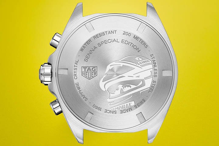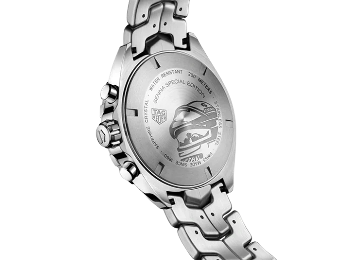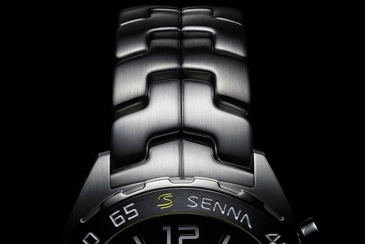 The 43mm case is steel, with screw-down crown at 3 o’clock and screw-down case back with special Senna engraving. Water resistant to 200 meters, it can take on all challenges.
