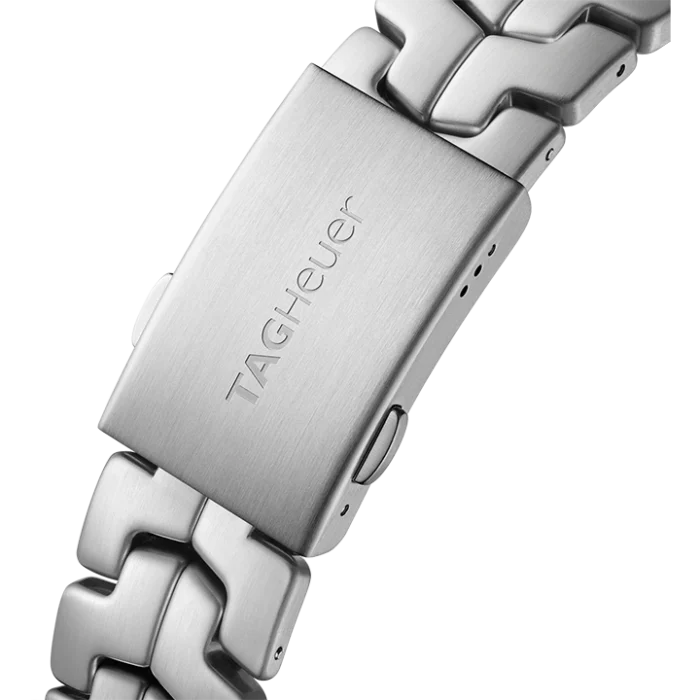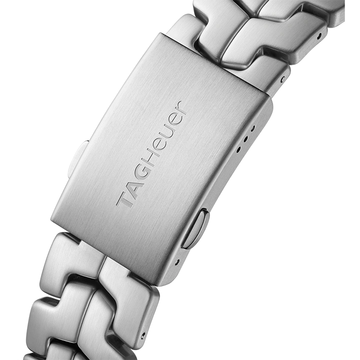The tachymeter fixed bezel is in black ceramic, circular brushed to perfection. Under the hood, a TAG Heuer Swiss quartz movement.