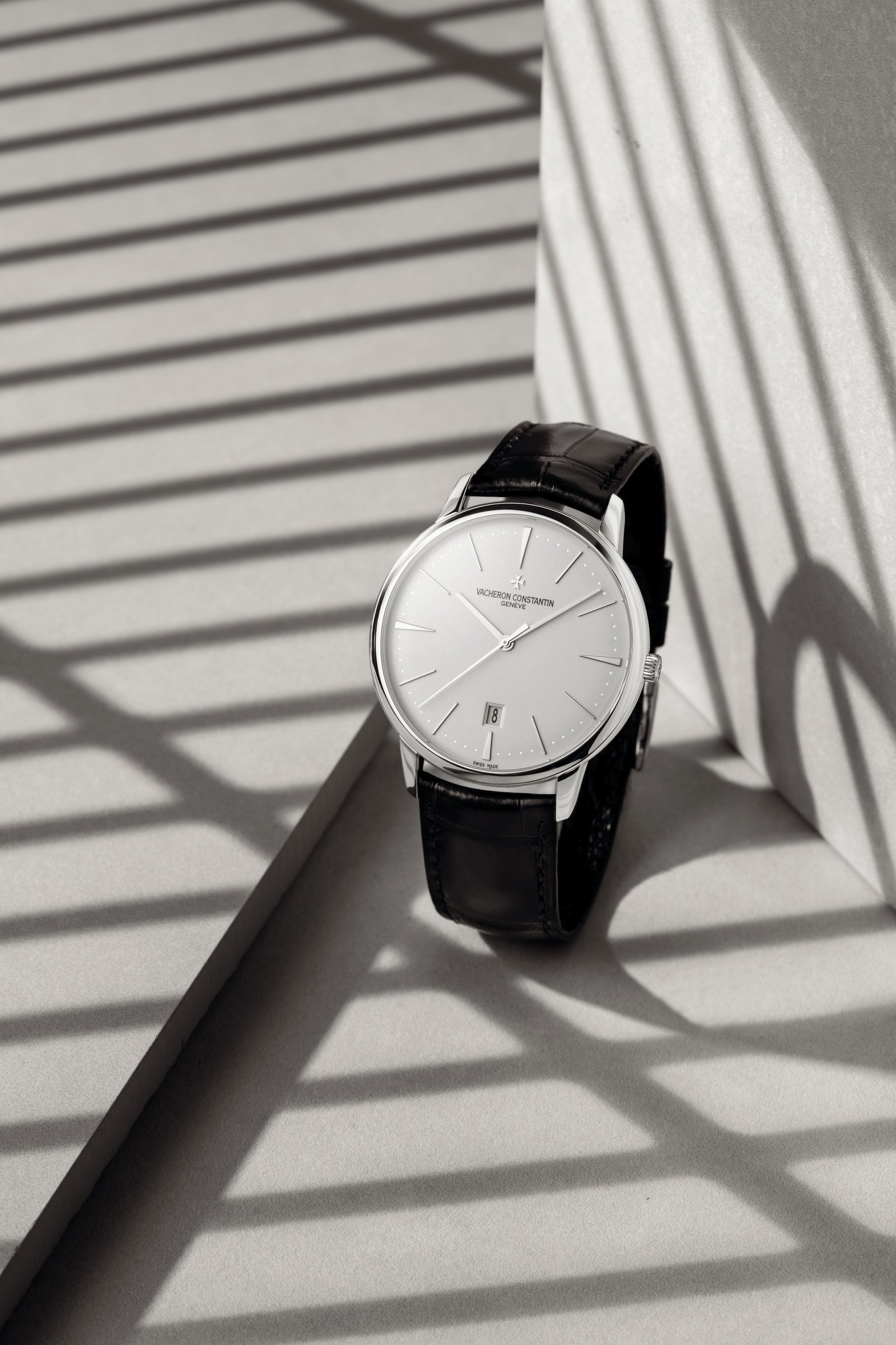 From the Patrimony Collection. Inspired by classic watches of the 1950s, this elegant timepiece boasts a round 18K white gold case, silvered dial and date display at 6 o’clock.